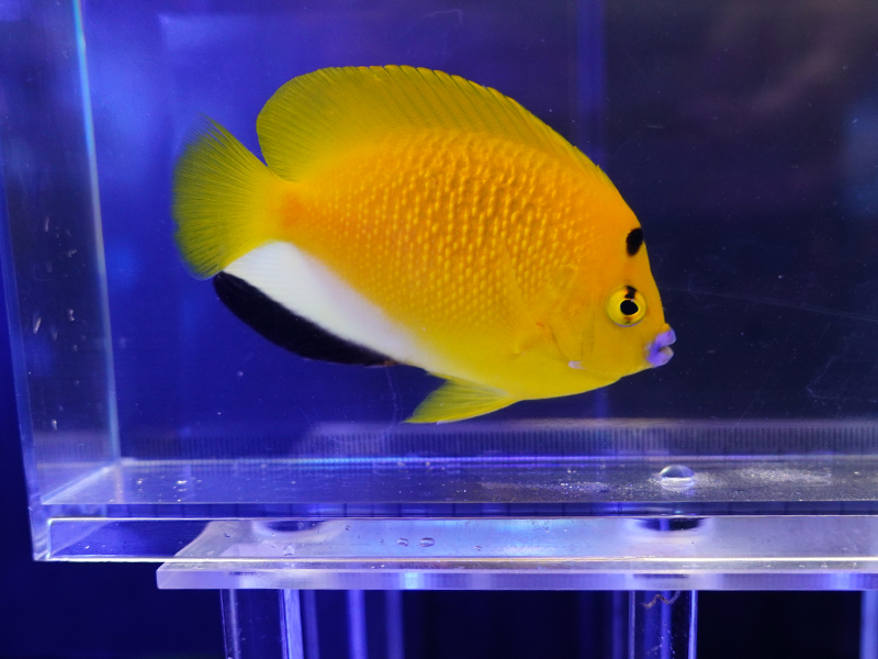 説明:真っ黄色の体に黒いマロ眉がつく中型ヤッコの仲間。餌付きもよく飼育しやすいので中・大型ヤッコの入門種です。性格も温和で他魚種ともケンカが少ない印象です。