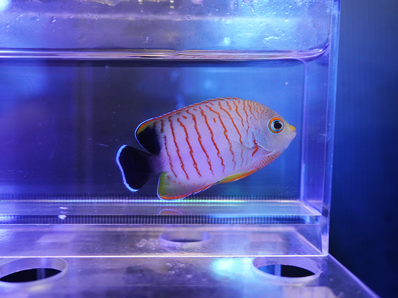 説明:別名エイブルズエンゼル。オレンジの縞模様は個体によって入り方が違い、模様が薄くナメラヤッコ寄りの個体も見られます。やや餌付きにくい傾向があり冷凍ブラインシュリンプなどから慣らしていく事が多いです。サンゴは食べてしまいやすい種類なので、サンゴ水槽での飼育は難しめです。