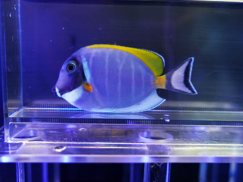 説明:インド洋原産のハギ。青い体と黄色いヒレの組み合わせが綺麗なので人気があります。草食なので植物性のエサを与えるのが◎。最大で30cm前後まで成長します。