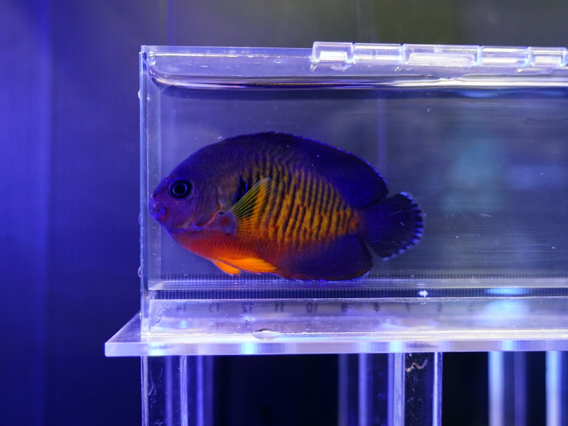 説明:濃いめの青にオレンジが入る小型ヤッコの仲間です。採取場所によって色合いが変わり、青が多い個体やオレンジの範囲が広い個体とバリエーション豊富です。サンゴとも相性が良く、初めてのヤッコ飼育にもオススメです。