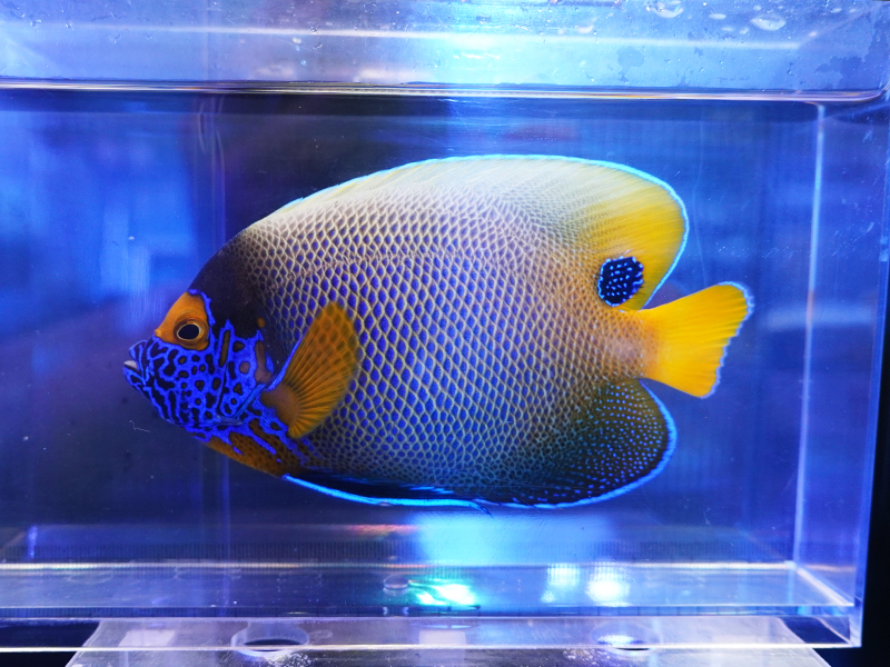 説明:別名アデヤッコ、成魚になると模様が大きく変化します。少し臆病なので水槽導入直後は隠れてしまいがちですが、慣れるとしっかりと泳いでくれるようになります。