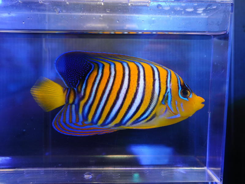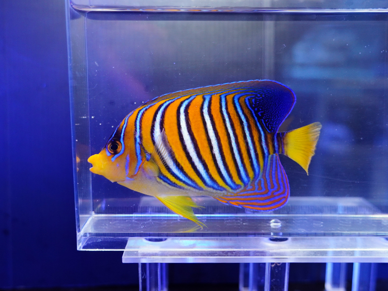 説明:サンゴ水槽でも飼育可能。水槽導入直後はフレーク餌など目の前でヒラヒラする餌から始めると食べ出しやすいです。アゴ下まで黄色くなるインド洋タイプです。