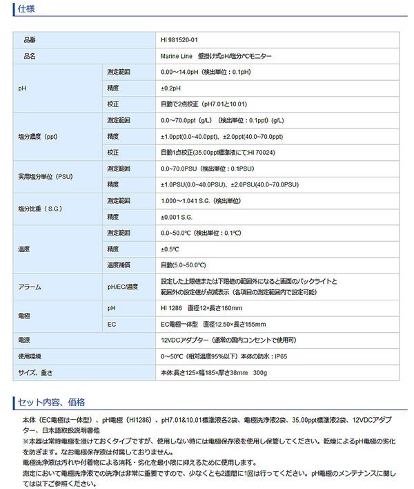 MarineLine(マリンライン)シリーズは世界中で多くのアクアリストに愛用されており、その中でもHI 981520はpH/塩分/℃を常時測定しモニターできる製品です。