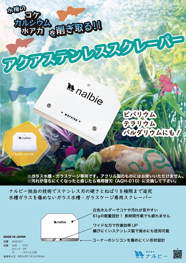 錆に強いステンレス製の刃は、角を落として水槽コーナーのシリコンゴムを傷めにくい形状です。ナルビーならではの技術で、刃の硬さやねばりを極限まで追求しました。