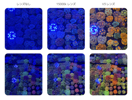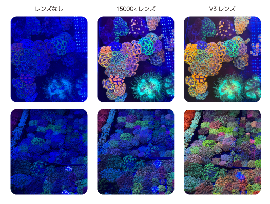 V3レンズはブルーライトの影響を効果的に抑え、サンゴの色をより鮮やかで美しく表現。特に、サンゴ育成用ブルーライトのみが点灯した環境下(室内照明消灯)で高い効果を発揮。
